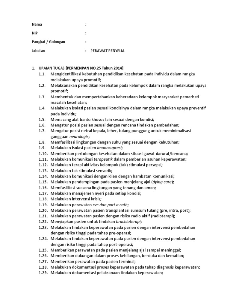 Asslm,mau nanya bgmn cra nambah uraian tugas di skp perawat di prwt ahli prtam a,sy prwt ners tp di dinkes krja yg didownload urain.tgsx ngk da,tp di rincian menu update ada,gmn y crax,mhon bntuan, trimaksi. Skp 2016 perawat penyelia martin. Isi nama pejabat penilai dan pegawai yang dinilai pada kolom yang sudah disediakan nama pegawai. Mywaypematangsiantar 21 april 2018 22.55. Uraian tugasnya yaitu melakukan kegiatan asuhan keperawatan, dan pengelolaan keperawatan. 25 tahun 2014 yang terdapat pada bab iv pasal 6, yaitu sebagai berikut: Sasaran kinerja pegawai yang selanjutnya disingkat skp adalah rencana kinerja dan target yang akan dicapai oleh seorang pns yang harus dicapai setiap tahun. Penata tingkat i, golongan ruang iii/d. Medianers ~ apa saja uraian tugas jabatan fungsional perawat penyelia? Jd saya mau coba buat sendiri. 0% 0% found this document not useful, mark this document as not useful. Mengenal angka kredit perawat terbaru pada jabatan fungsional. Demikianlah beberapa ulasan artikel tentang contoh membuat sasaran kerja pegawai untuk perawat penyelia yang dapat anda jadikan referensi untuk mengetahui lebih jauh mengenai contoh membuat sasaran kerja pegawai untuk perawat penyelia.